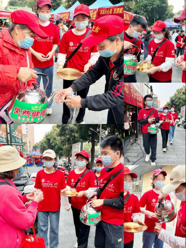 清晨8时左右,师生志愿者抵到活动地点,井然有序的主动投身到会场布置、物料搬运、悬挂横幅等工作中。在党员志愿服务队工作站,志愿者们协助码上素食、海音送茶志愿服务队等爱心团体开展一线送温暖活动。他们穿梭在人群之中,为过往老年人群众、工作人员送上敬老爱心餐劵、暖心茶水、八宝粥,一声声“谢谢......”,让他们沉浸在忙碌中“乐此不疲”,大街小巷一派“热气腾腾”的景象。