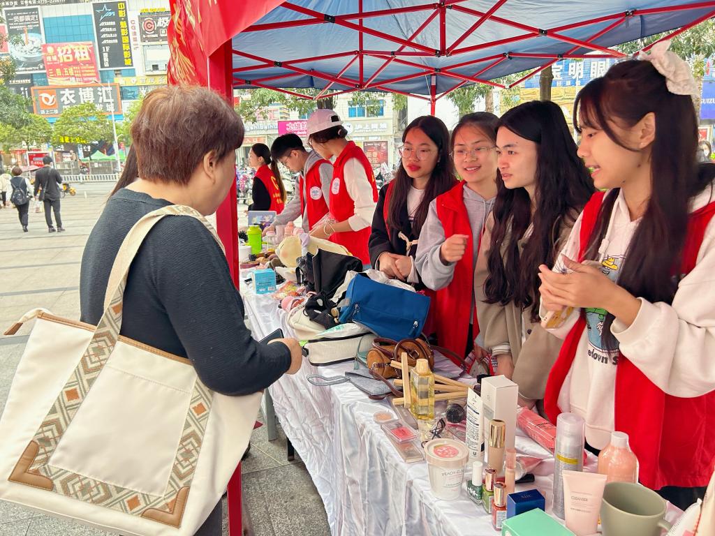 义卖现场,摊位前人头攒动、热闹非凡,志愿者热心耐心讲解,为闲置物品寻得有缘人,筹得更多爱心善款。爱心义卖活动持续近3小时,师生共同将义卖善款775.20现场捐赠给了社区普利社会工作服务中心用于助老纾困