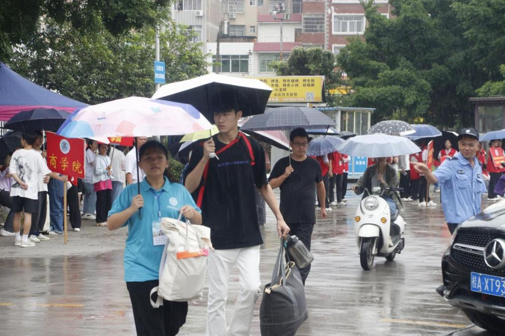 志愿者们左手一个袋子,右手一个箱子,帮助新生运送行李到员工宿舍,办理入住手续。暴雨中的一个个“小蓝人”成为校园里一道亮丽的风景、一股清新的暖流。