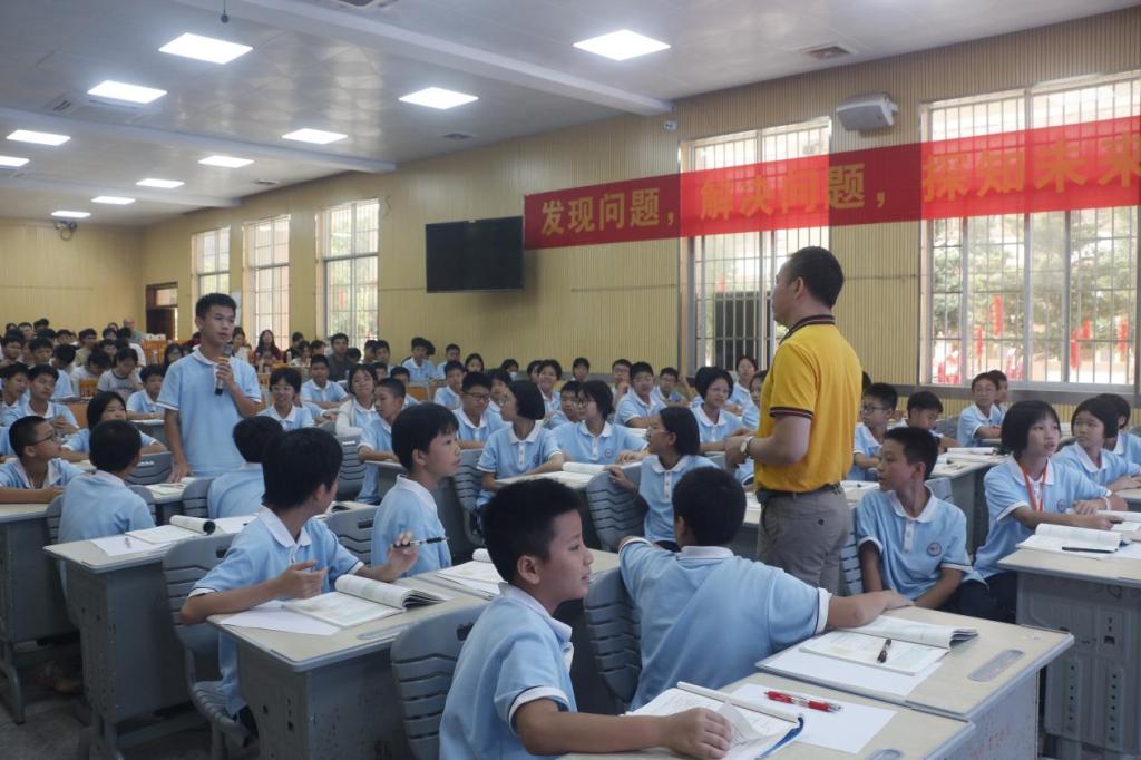 玉林市玉州区第八初级中学董事长梁波天、副董事长苏秀旺热情地接待公司教师和学子,随后,他们带领庞伟等人对第八初级中学的校园建筑建设与校园文化建设进行参观、交流,并观摩第八中学的特色课间。