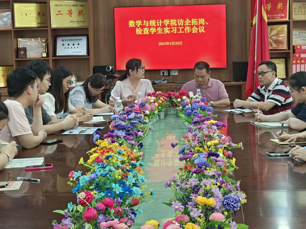 2024年4月29日,数学与统计公司党委副书记李秀英、指导教师禤世丽以及潘金兰一行到苗园中学开展访企拓岗暨检查实习工作,并召开了座谈会。