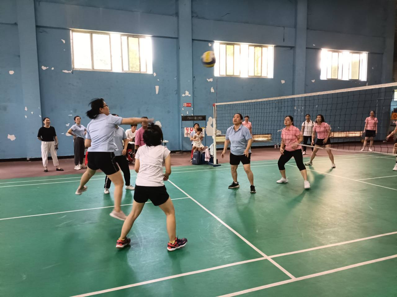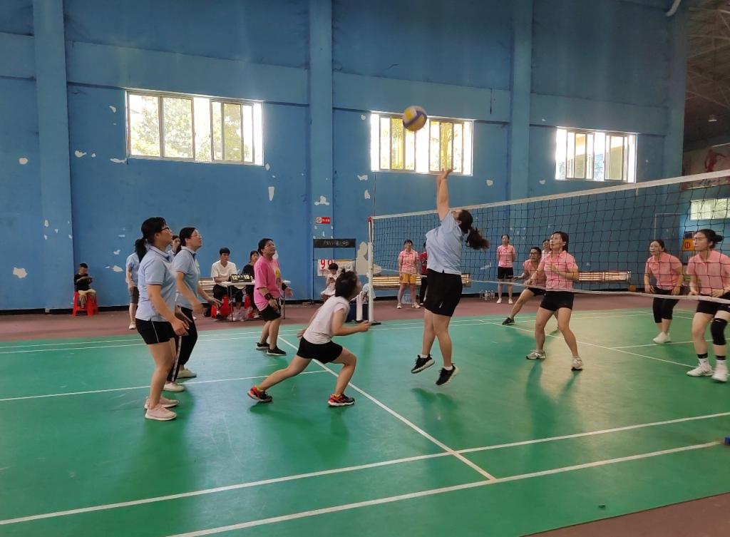 比赛实行三局两胜制。赛前双方都积极热身,随着哨声响起,比赛正式开始。双方队伍激烈竞争,你追我赶,拼尽全力,每个老师都展现出巾帼不让须眉之势;场下啦啦队热情高涨,加油欢呼声此起彼伏,赛场氛围瞬间被点燃。在中场休息时,双方球员积极商量对策,应对对方的每一次进攻。一个个精彩的扣球,拦网,双方球员都充分发挥自己的个人技术及战术配合,让在场的观众都欢呼不已。最终以大比分0:2遗憾落败。